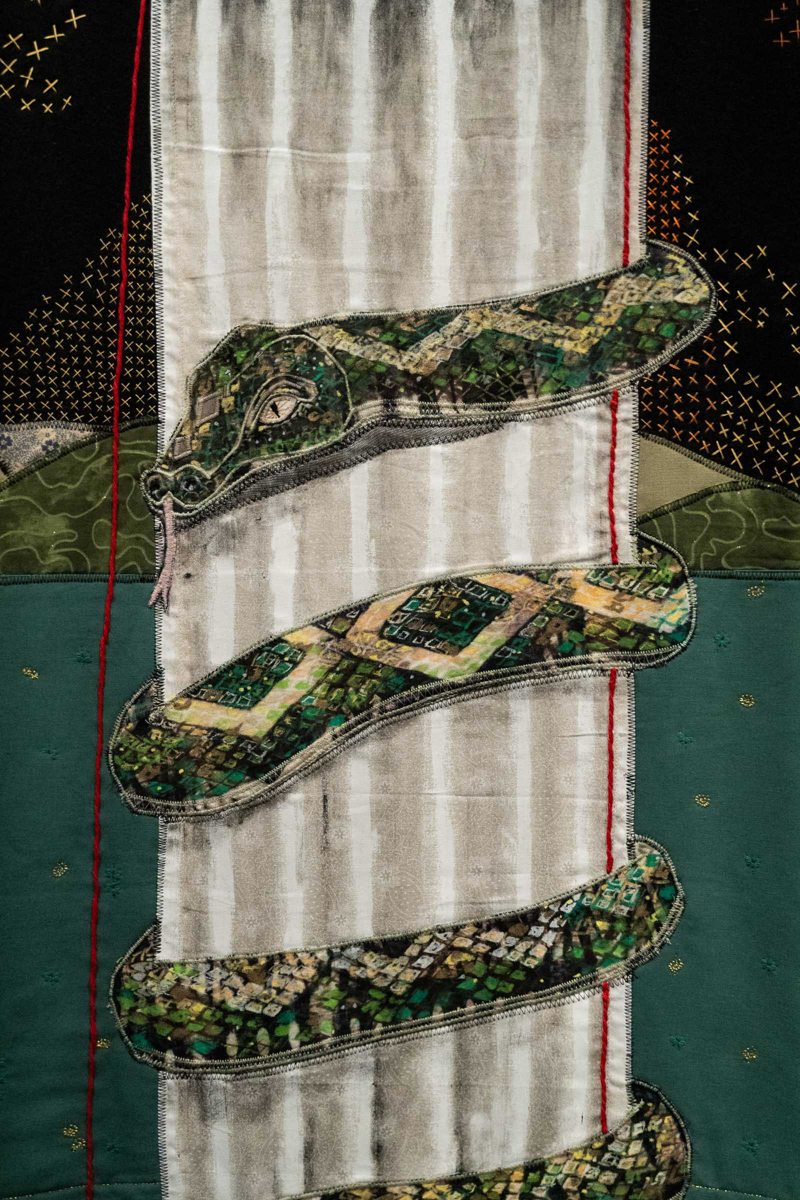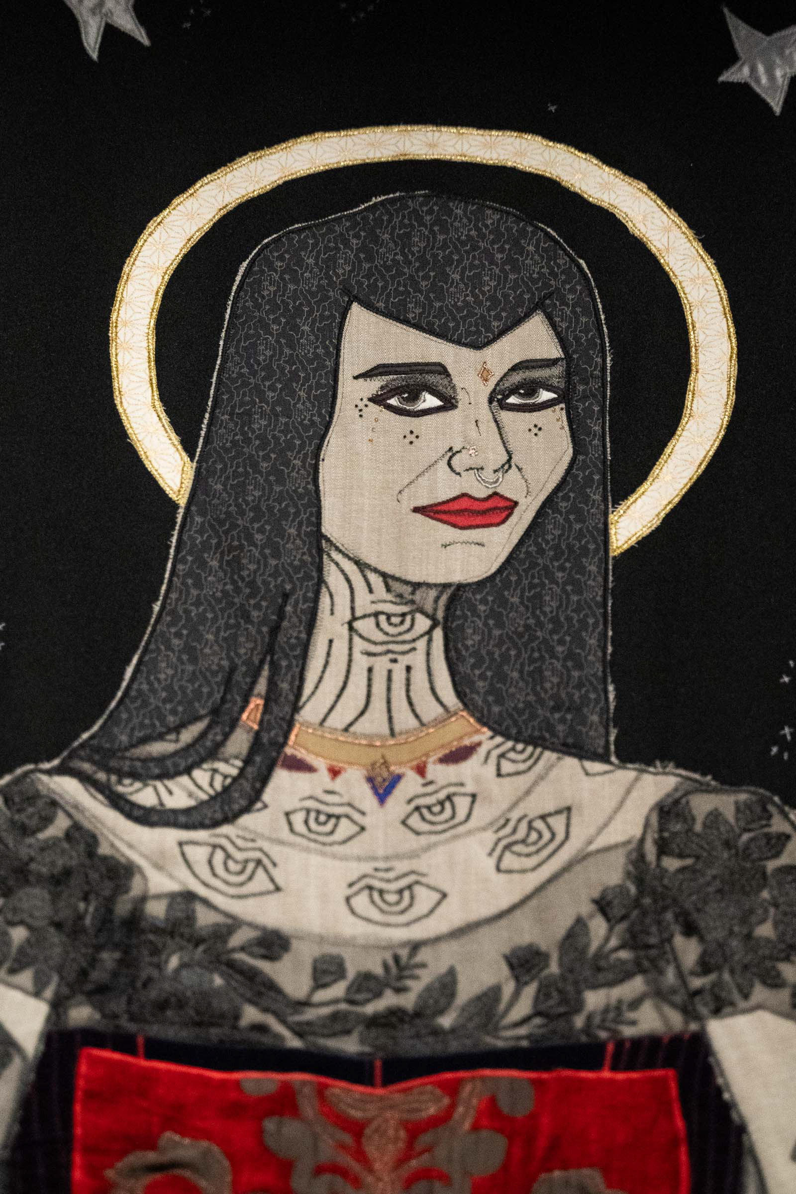 Using the motif of the vessel as an allegory for the body, this artwork depicts the lifecycle of women as they grow from child to maiden, mother, crone and finally ancestor. The three figures in the work represent the three sisters, Clotho, Lachesis and Atropos, who personify destiny in Greek mythology and are also known as the Moirai (Fates). Their role is to spin, allot and cut the thread of life, which is couched in red across each of the panels. Moving from spring to winter. This work is layered with theological references including nods to the Virgin Mother, Eve and to Marzanna, the Pagan Slavic goddess of death and rebirth.