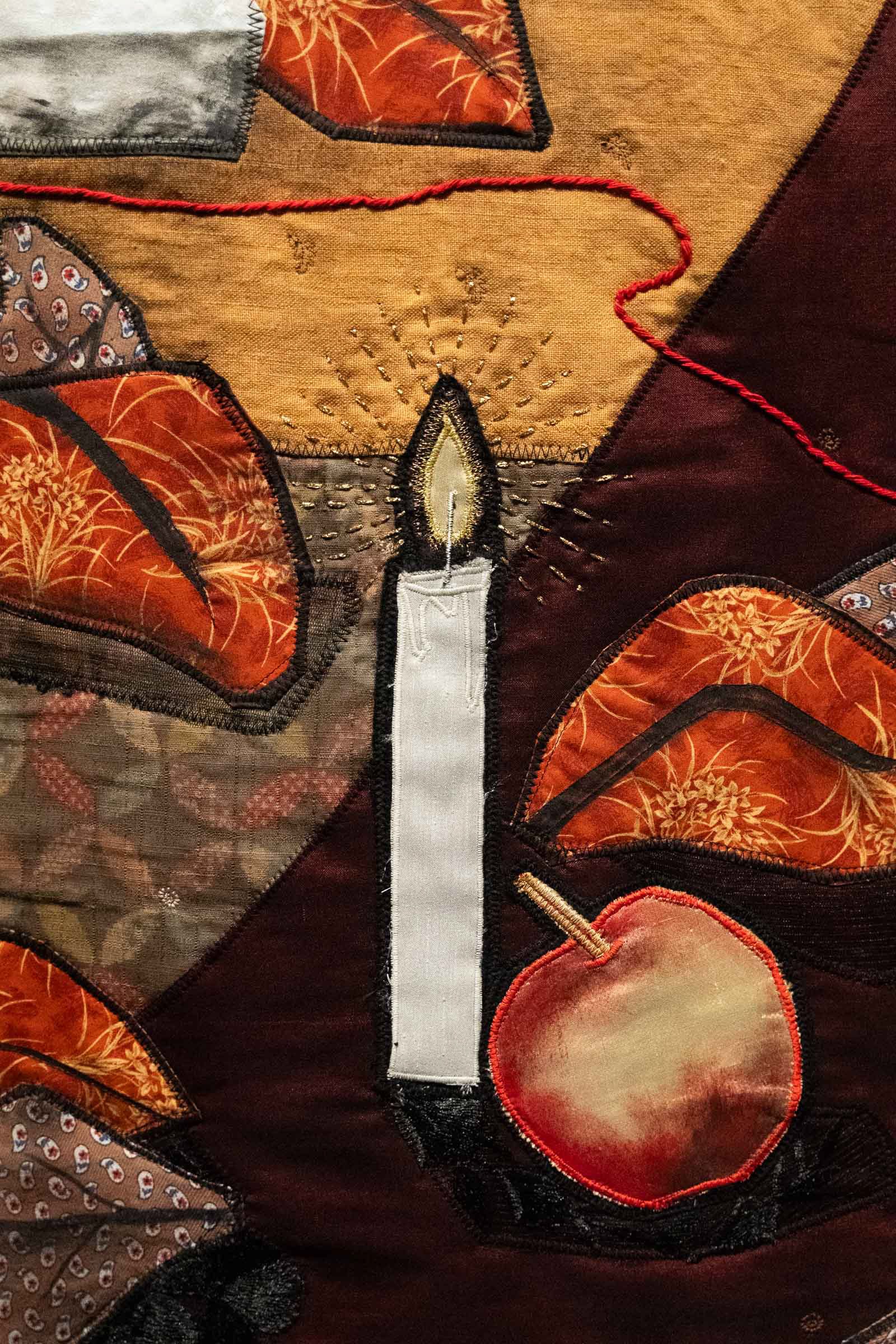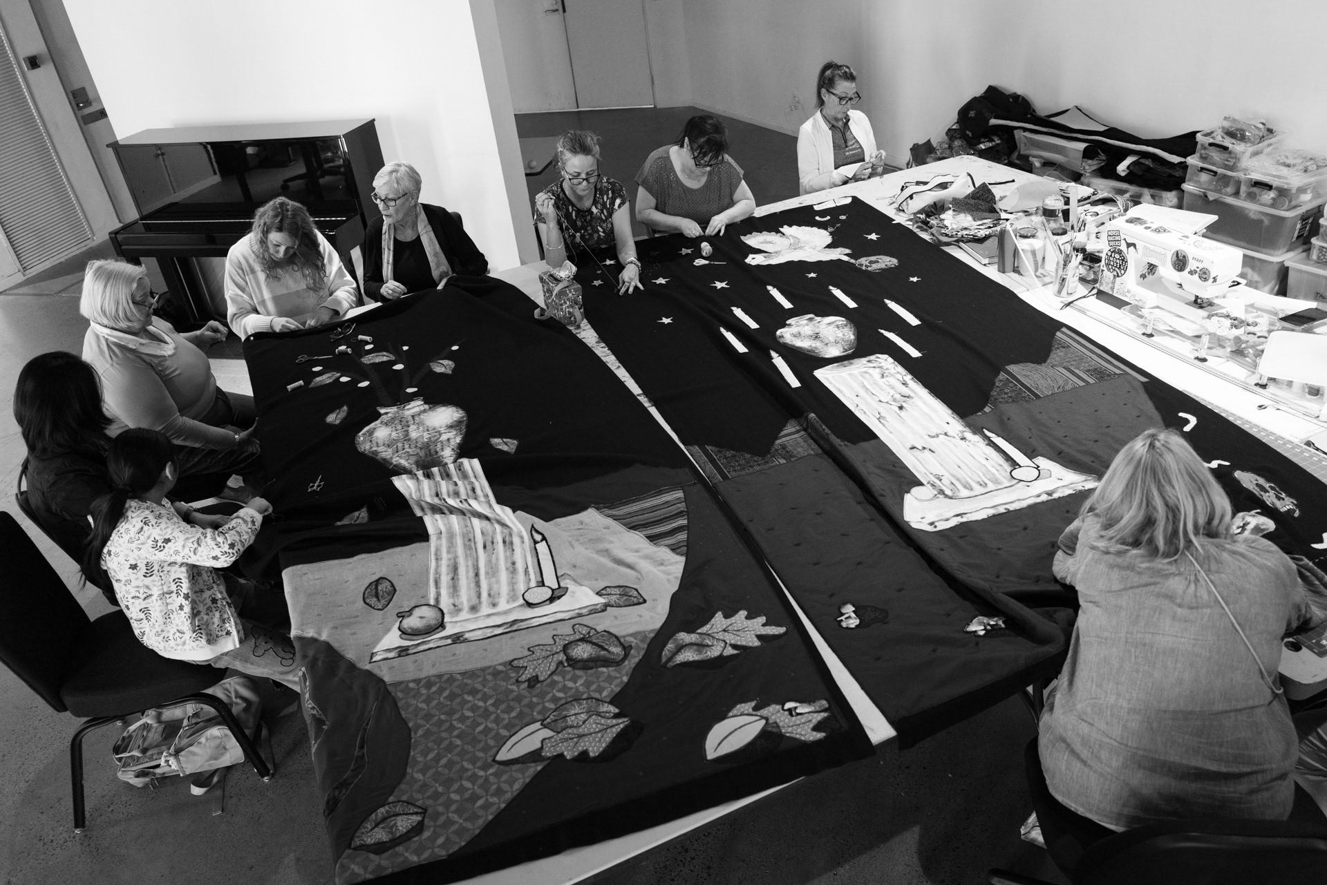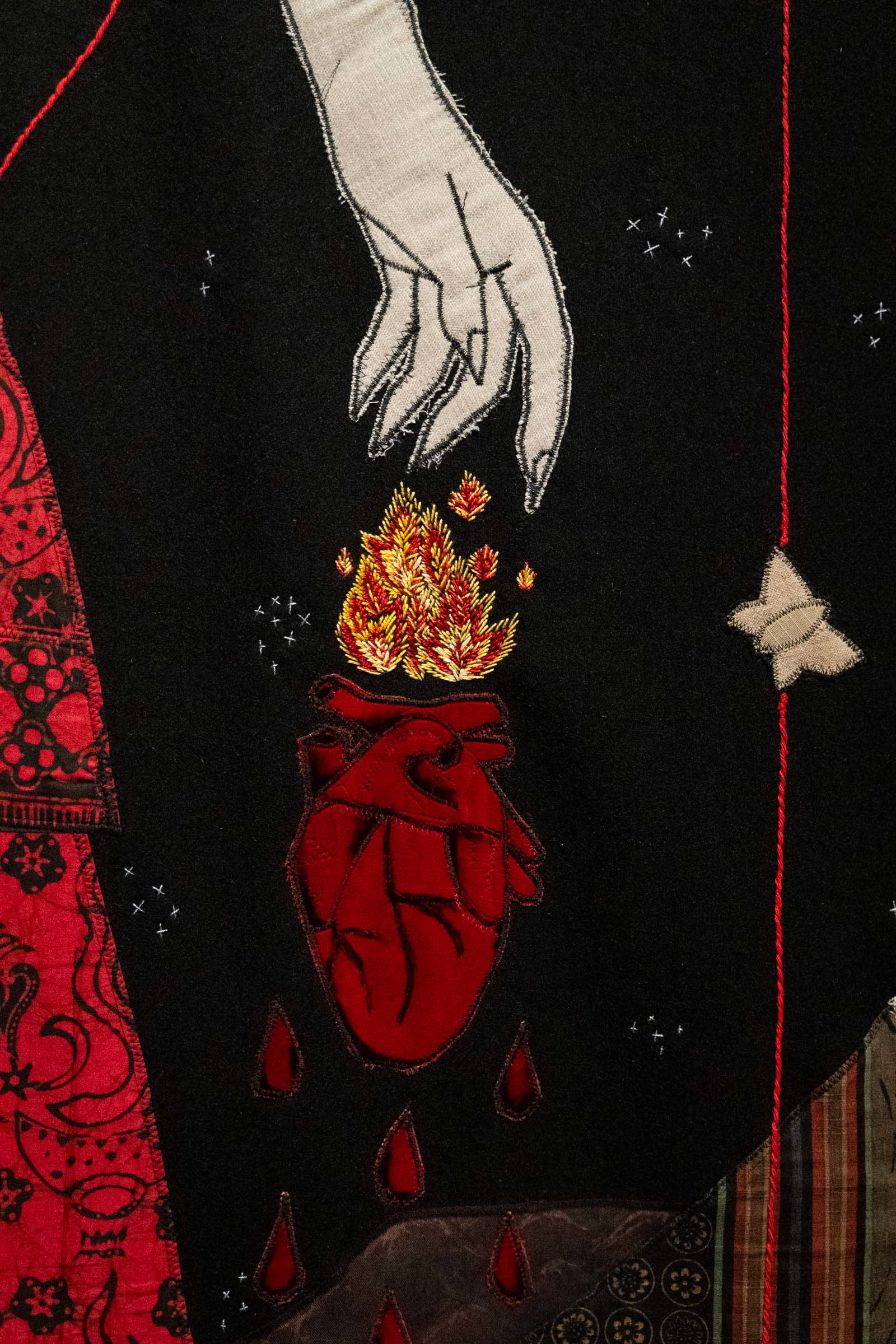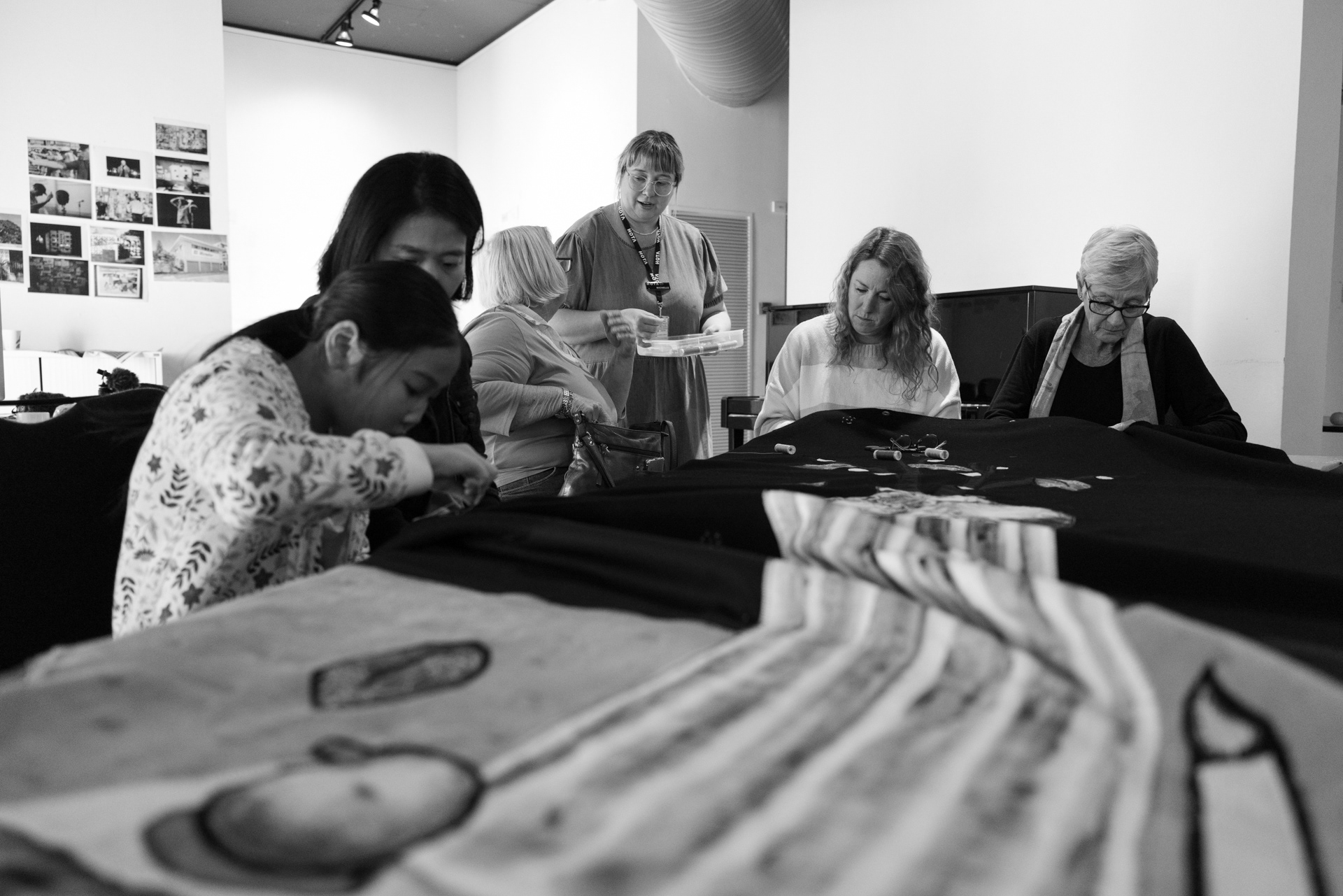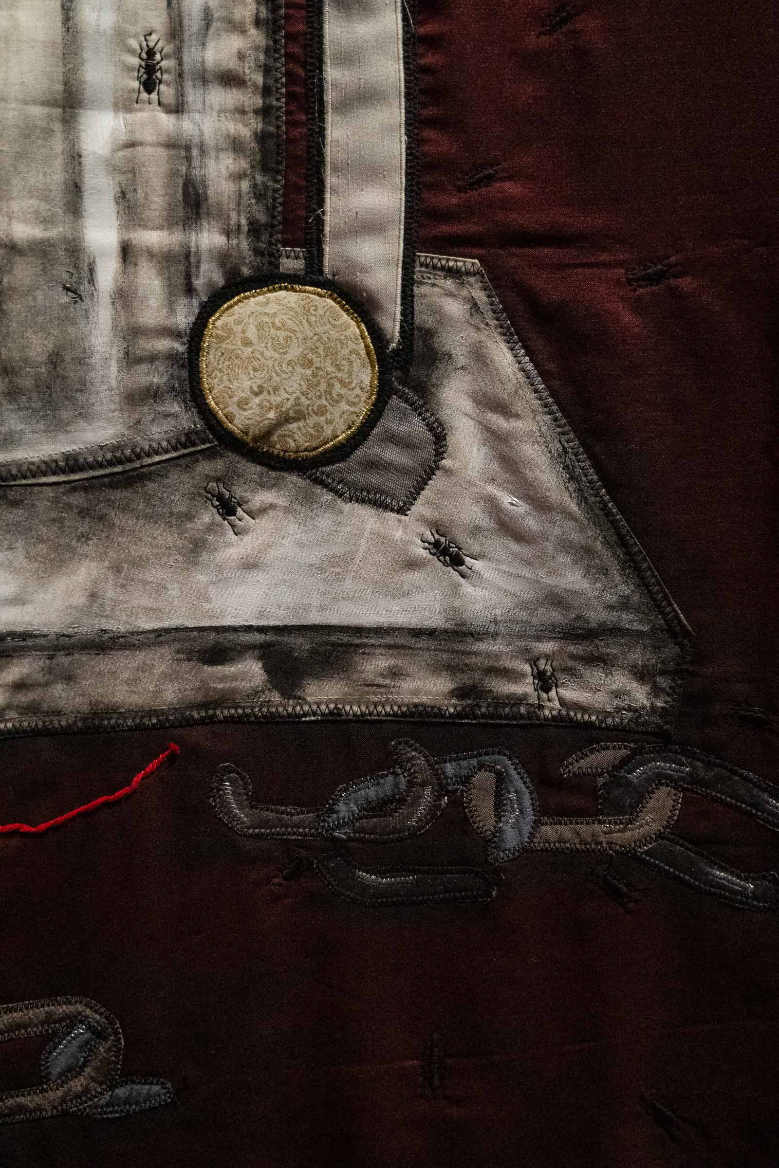 Much of the hand embroidered detail on the work was stitched by participants who attended a public cross-stitching workshop facilitated by Tal during her ArtKeeper residency.