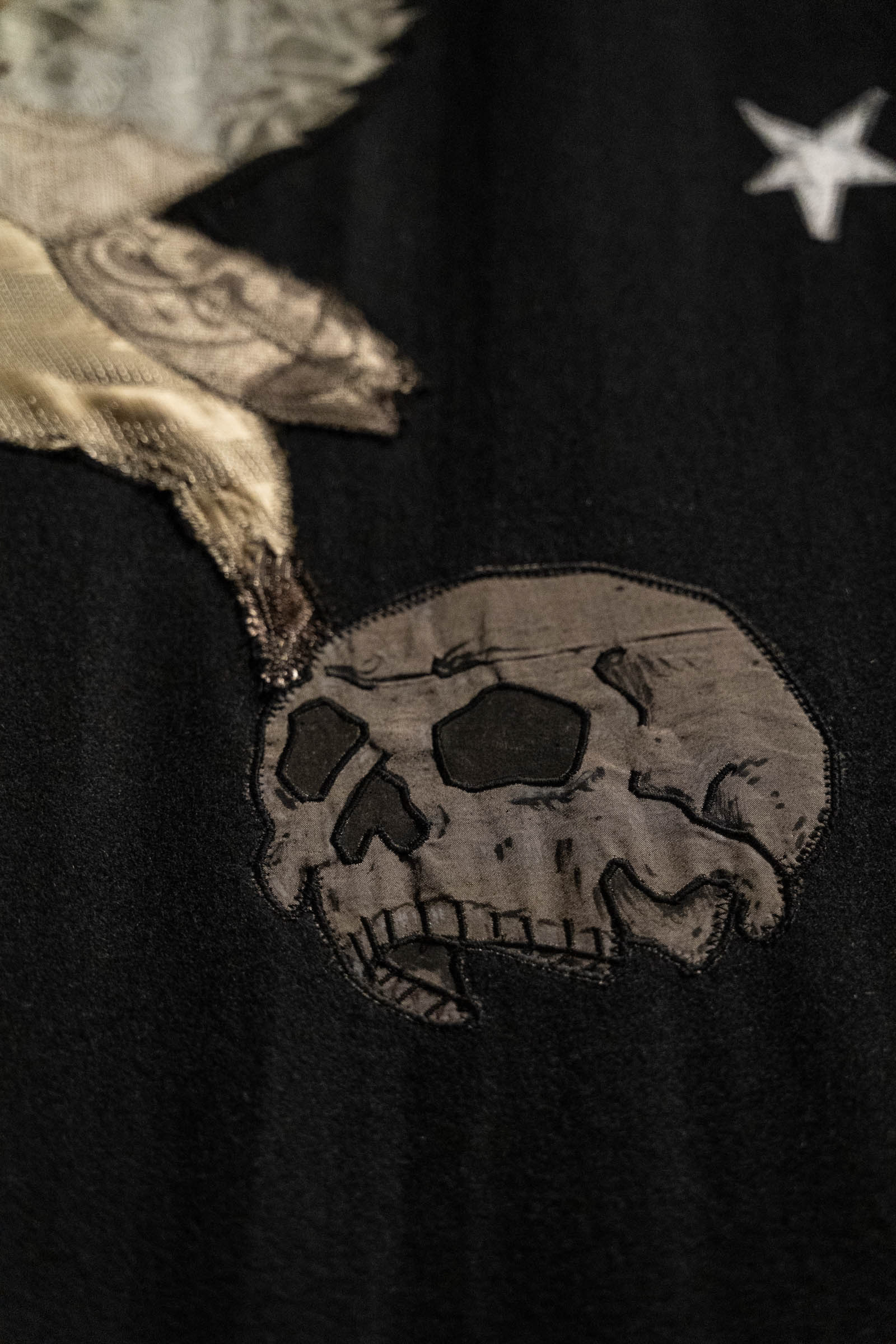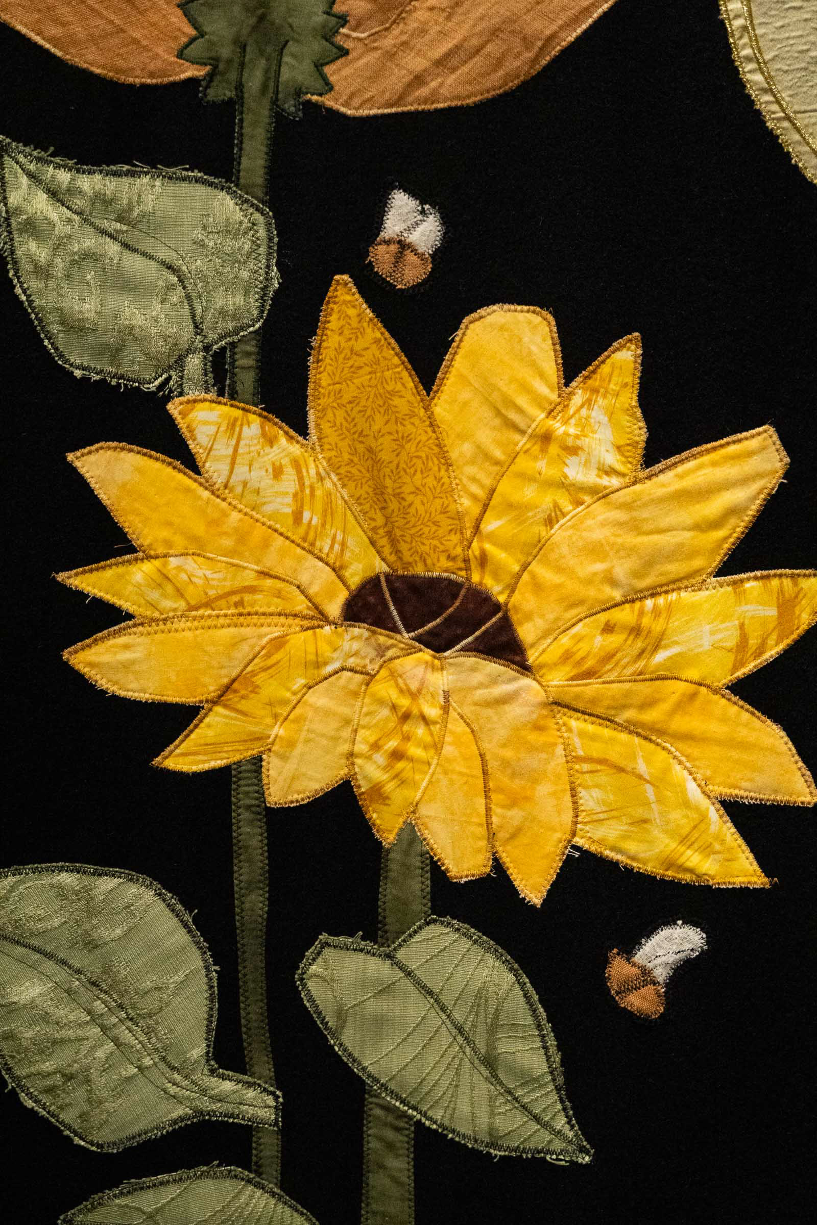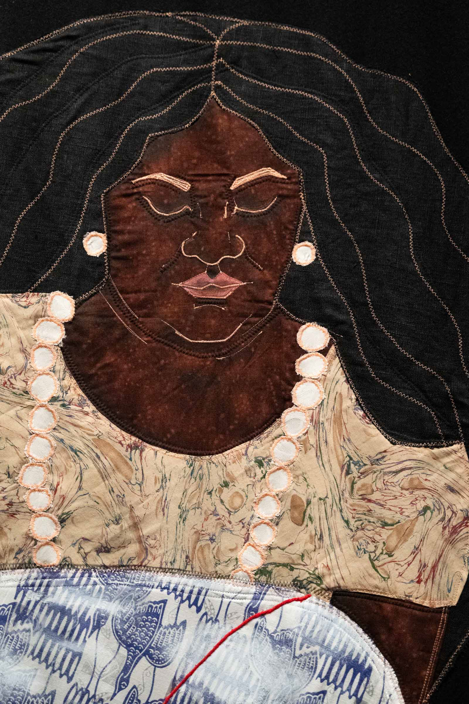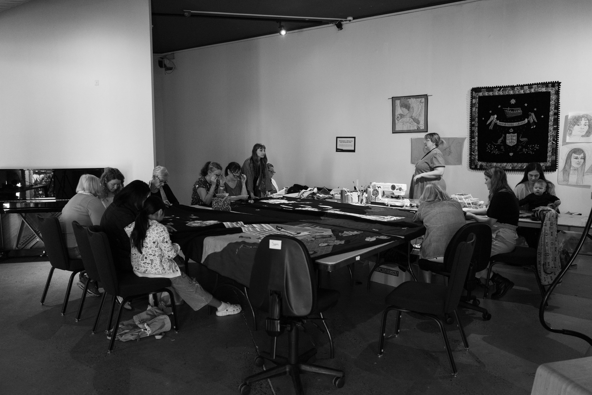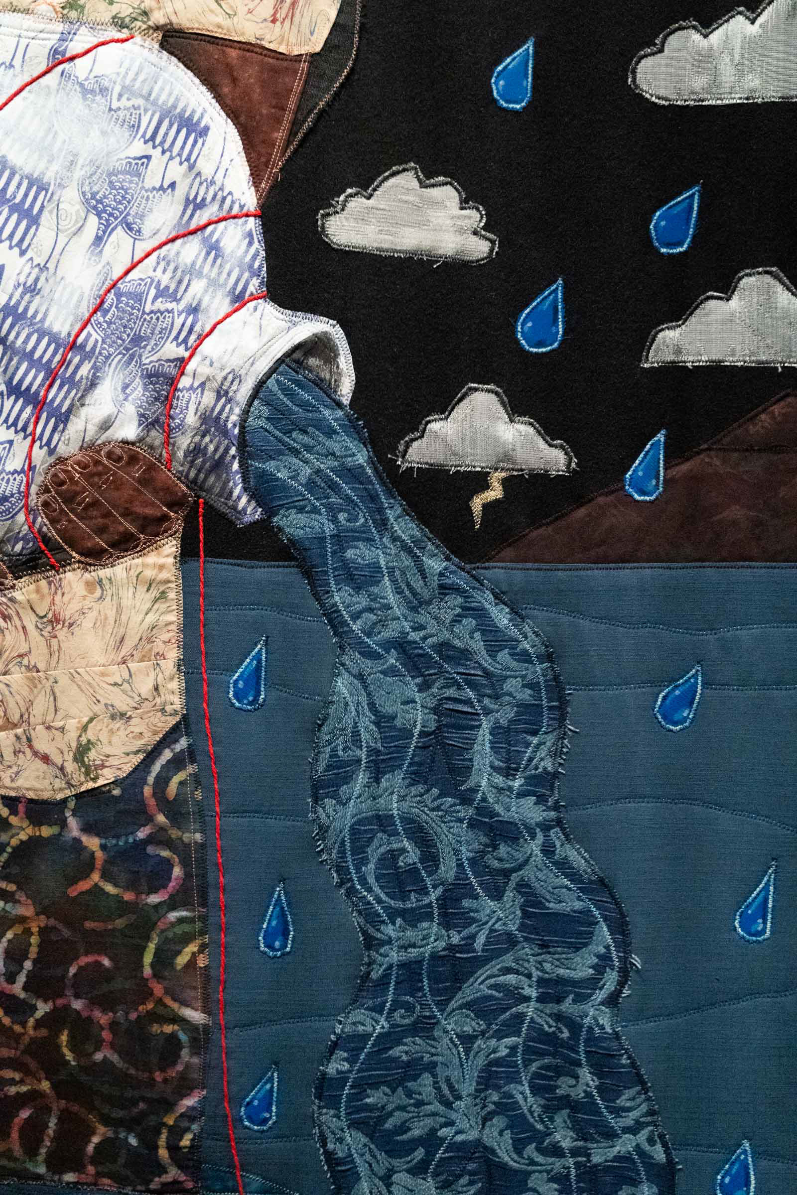Much of the hand embroidered detail on the work was stitched by participants who attended a public cross-stitching workshop facilitated by Tal during her ArtKeeper residency.