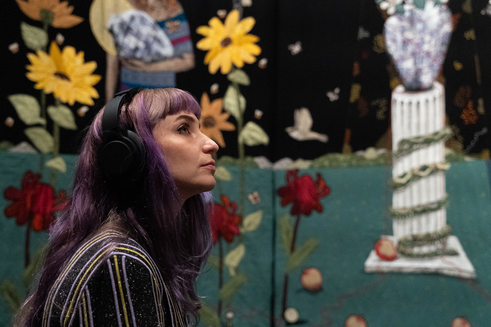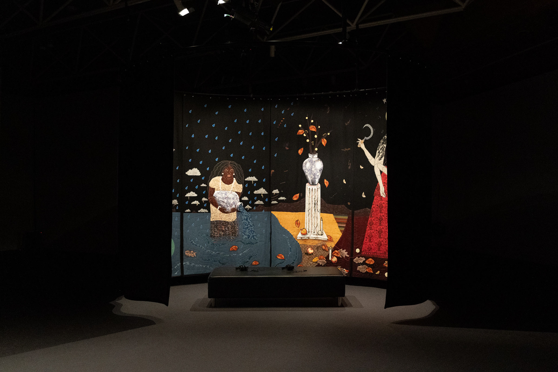 350 cm high x 307 cm wide x 443 cm long, audio 94min, appliqué quilted with hand embroidered details on repurposed wool theatre drapes, assorted fabrics, cotton and synthetic thread, fabric paint, glass beads, bent steel pipe suspended from the ceiling, MP3 players, headphones.