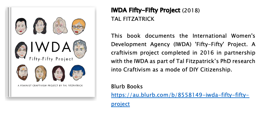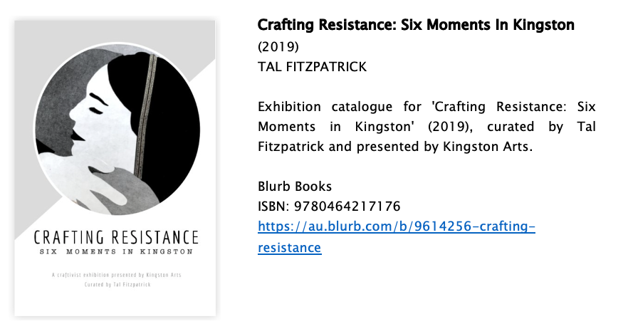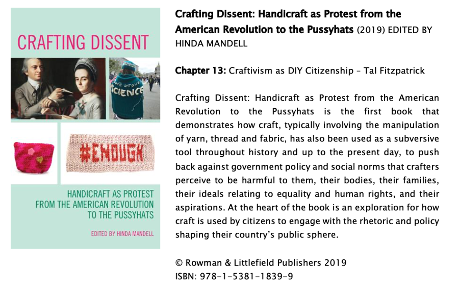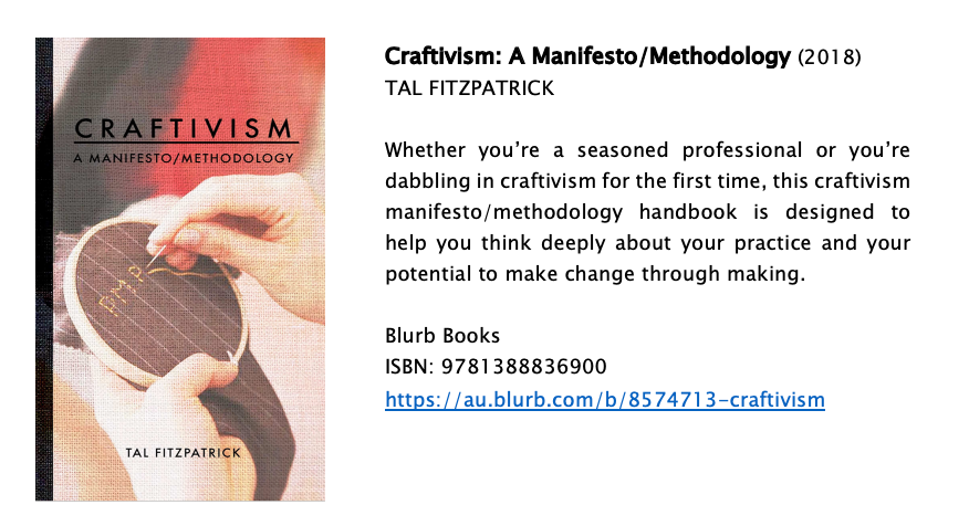 To read Tal Fitzpatrick's PhD Thesis 'Craftivism as DIY Citizenship: The Practice of Making Change' (2018) visit: https://minerva-access.unimelb.edu.au/handle/11343/219289?show=full