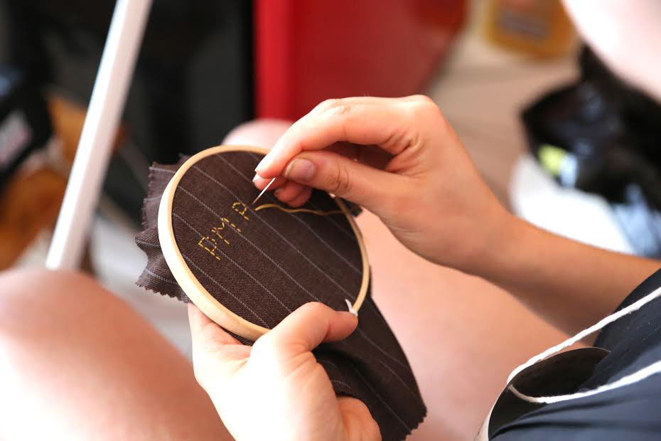 Work in progress, a participant hand stitching their message onto a suit swatche for the PM Please Quilt at HillsceneLIVE festival in Monbulk, Vic.