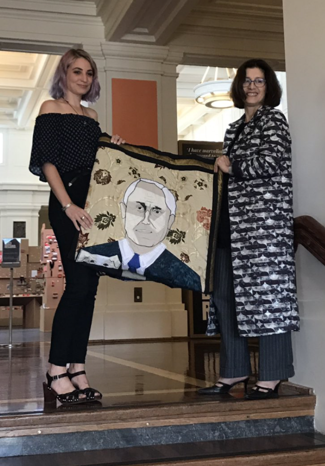 Documentation from the handing over of the PM Please Quilt to the office of the Prime Minister, two days before the 2016 election (right). Documentation of Tal handing over the PM Please Quilt to Daryl Karp, the Director of the Museum of Australian Democracy at Old Parliament House, Canberra on the 20th of March 2017 (left).