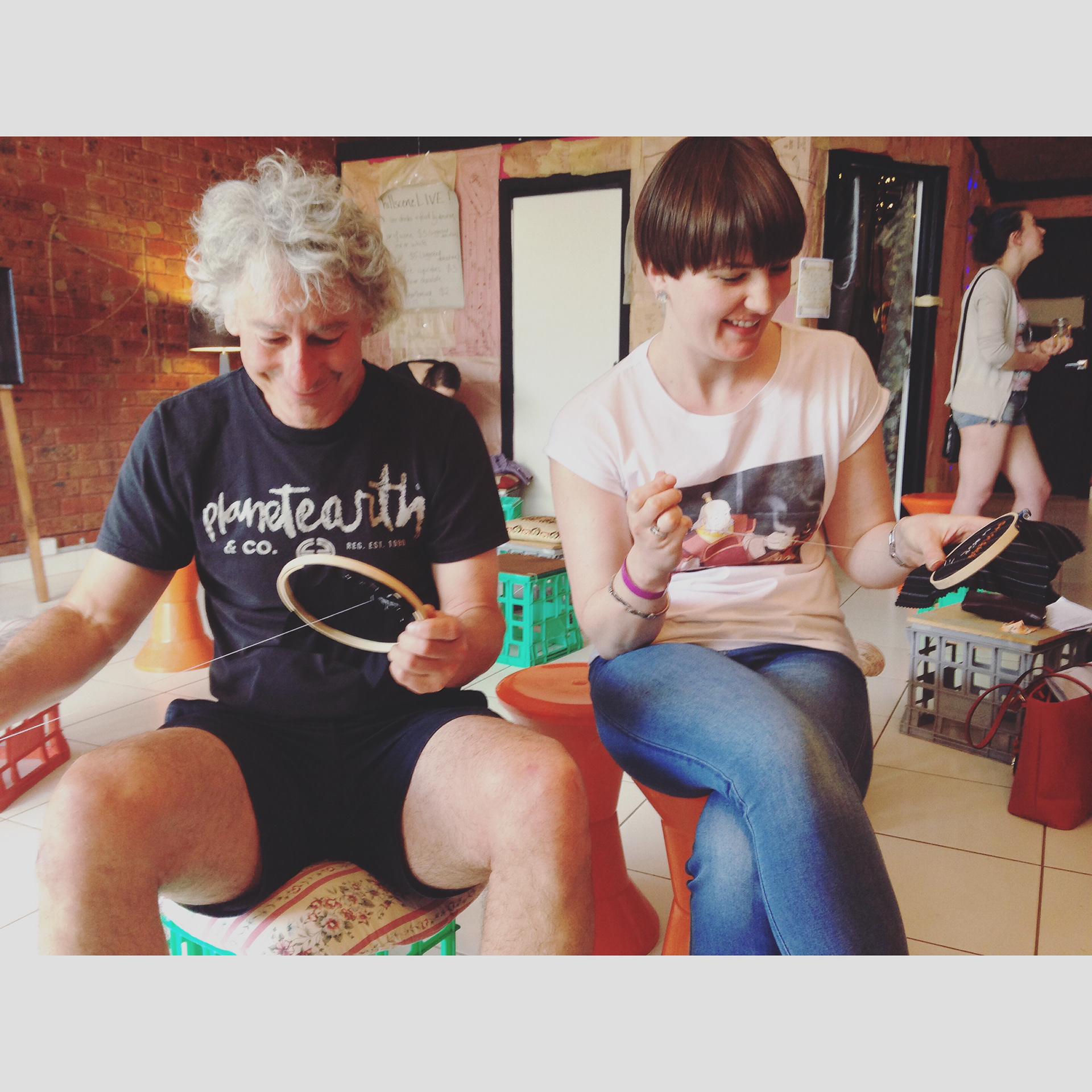 Participants Sam and KT stitching their messages for the PM at HillsceneLIVE 2015, Monbulk.
