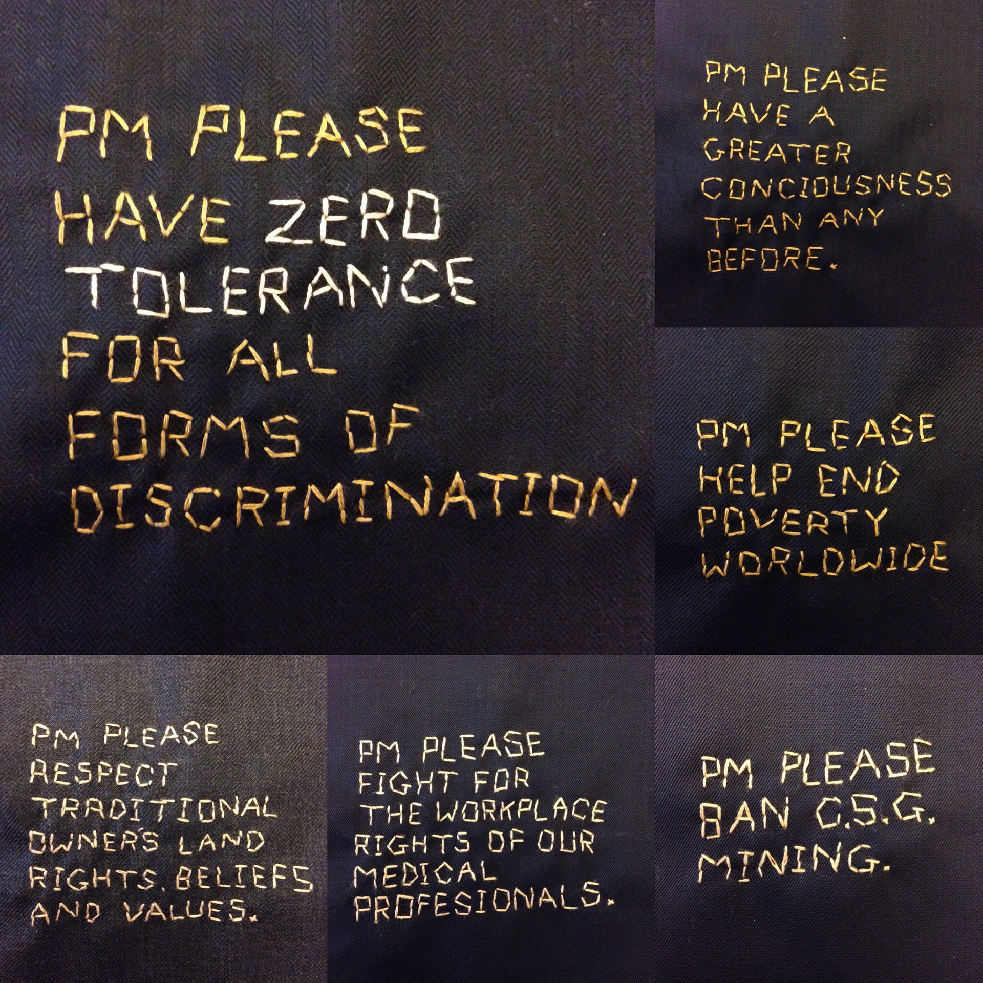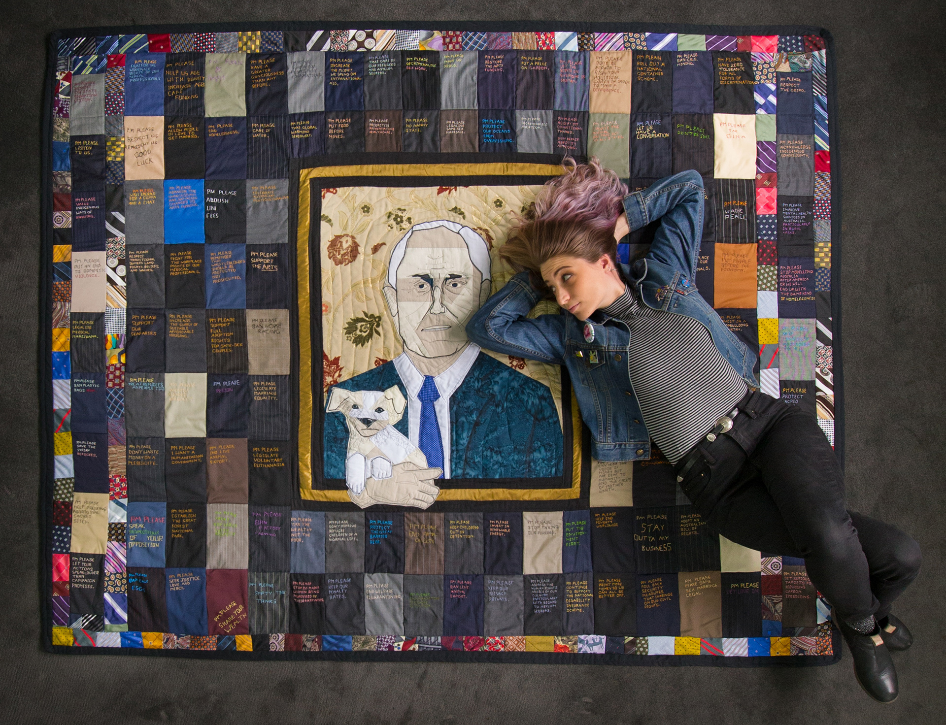 The PM (Prime Minister) Please Quilt is a socially engaged artwork made in the style of an Australian wagga quilt. This quilt was created as a gift for the then newly appointed Prime Minister Malcolm Turnbull, back in October 2015. The quilt was made using second-hand ties and suit swatches and is adorned with 121 hand-stitched messages to the prime minister, each beginning with the words PM Please. On the 20th of March 2017 the quilt was donated by the artist, along with a letter from Malcolm Turnbull in response to the project (see below), to the Museum of Australian Democracy at Old Parliament House, Canberra.