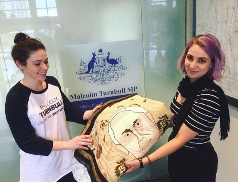 Following the completion of this quilt I spent about 8 months trying to leverage my social capital in order make contact with Turnbull so that I might give him the quilt as a gift on behalf of all the people who contributed to this project. However, with the 2016 election coming up fast I decided to drive to Turnbull's office in Sydney and hand the quilt over in person. His office accepted the quilt and two days following the announcement that Turnbull was elected the Prime Minister I received a call to say that the PM had seen the quilt, that appreciated the work that went into making it and that he was happy to accept this gift.