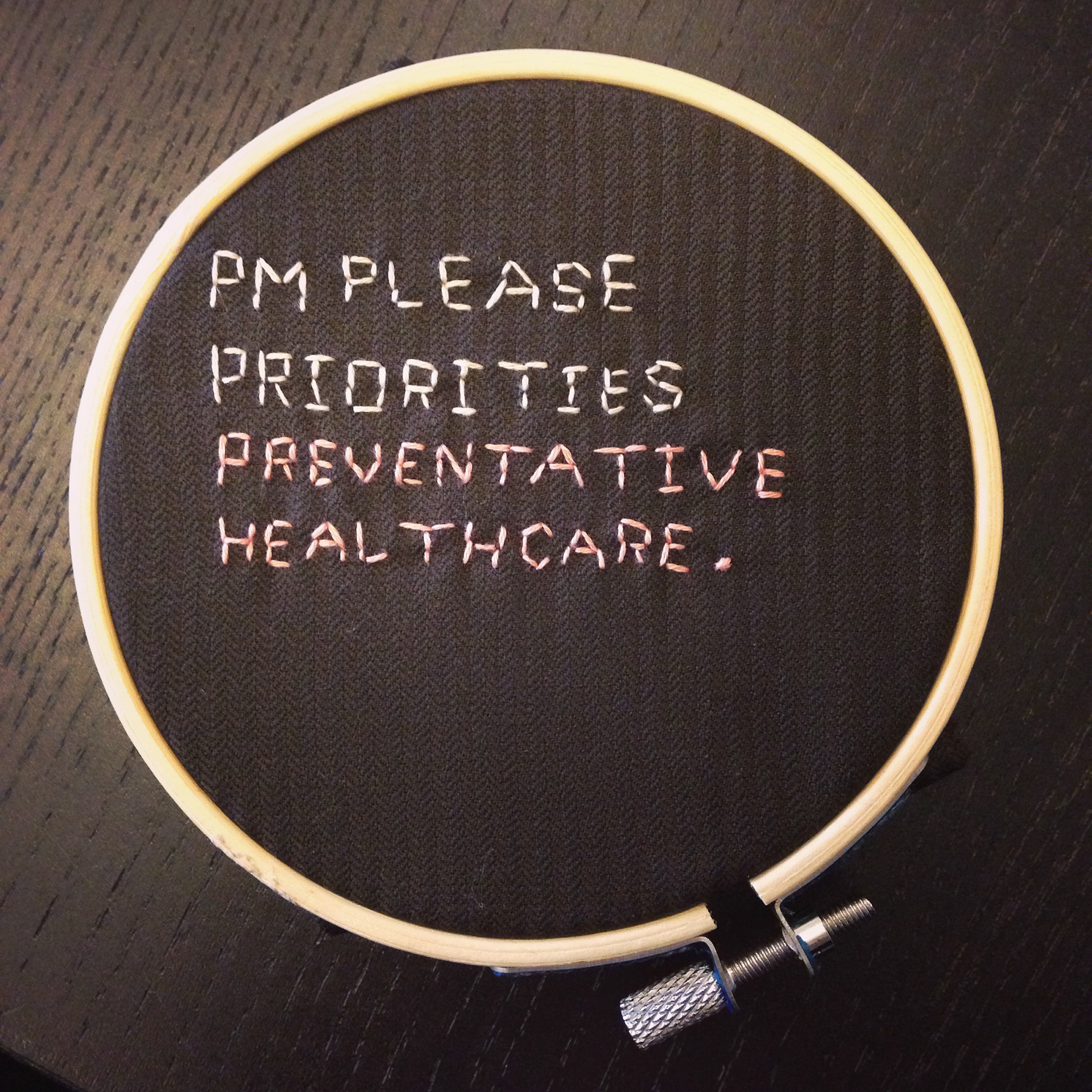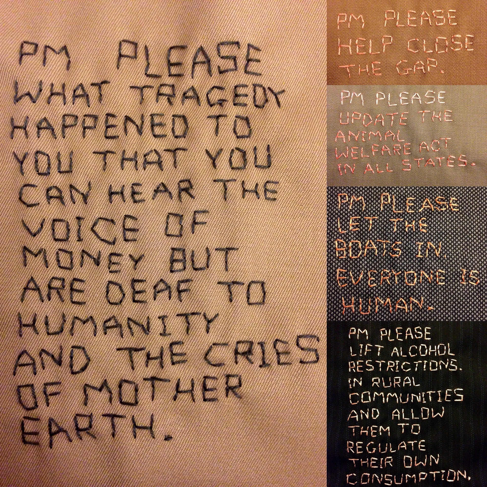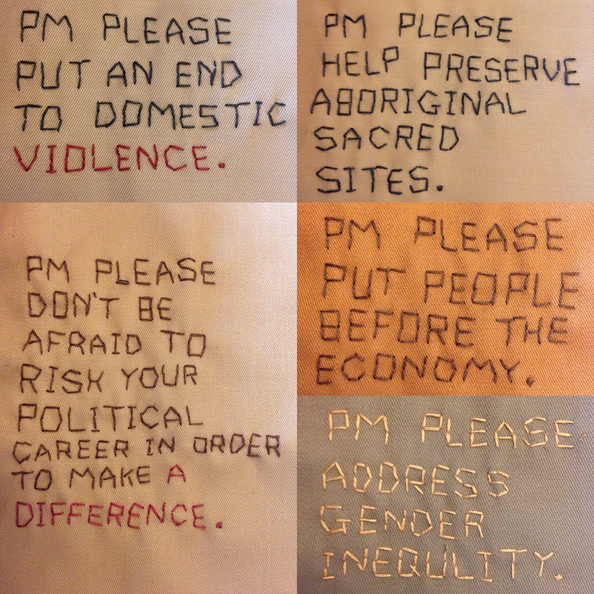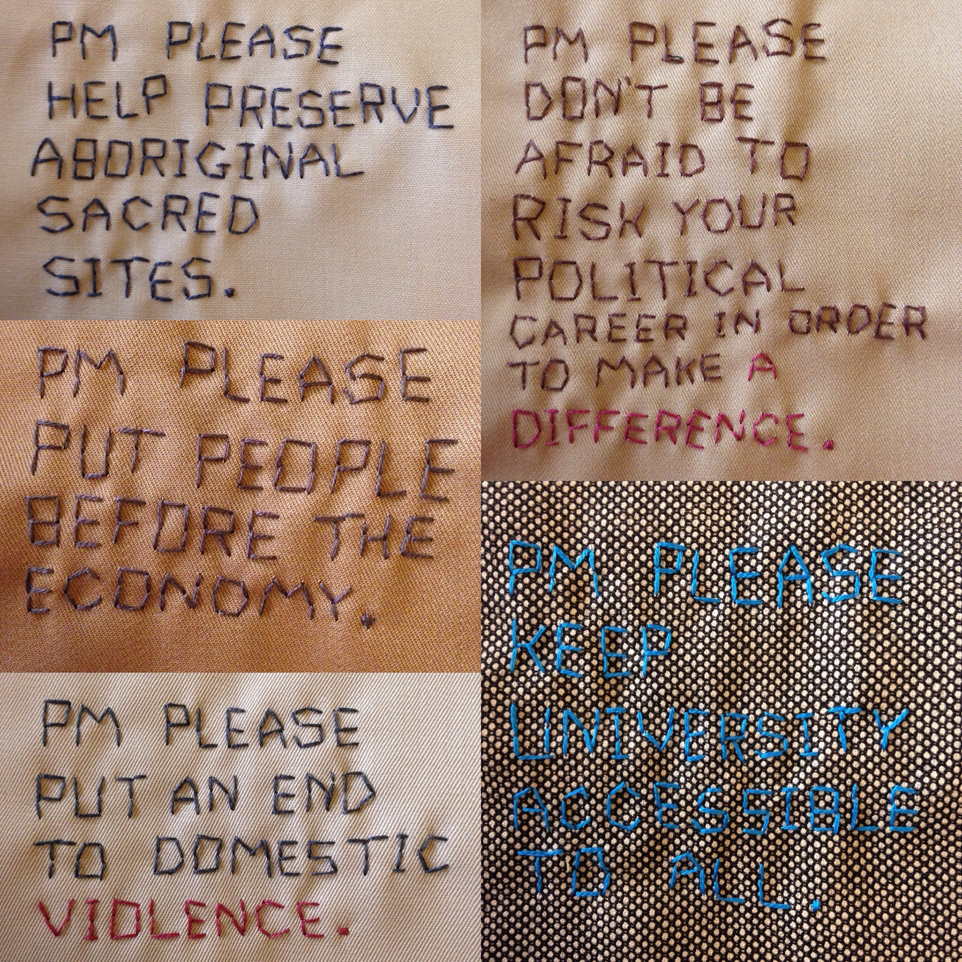 The idea for this quilt came in October 2015, not long after Turnbull (yet another new Prime Minister) was sworn into office. At the time there was a very palpable shift in the way people perceived the government as a result of the latest leadership change, a shift marked by a renewed hope that it may once again be possible to engage in more complex and inclusive dialogue about the future of Australia. With a federal election less than 12 months away I felt that there was no better time to reach out to the Prime Minister in order to try communicate what’s really important to us ordinary citizens.
