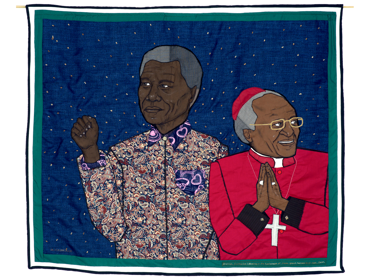 "Mandela & Tutu" (2016) 140cm X 120cm, appliqué quilt made using new and recycled materials. Commissioned portrait of Nelson Mandela and Archbishop Desmond Tutu