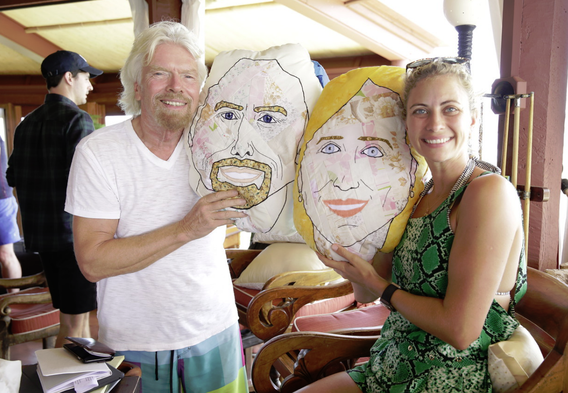 Richard Branson and his daughter on Necker Island with their portrait pillow gifts commissioned by Igniting Change (2016)