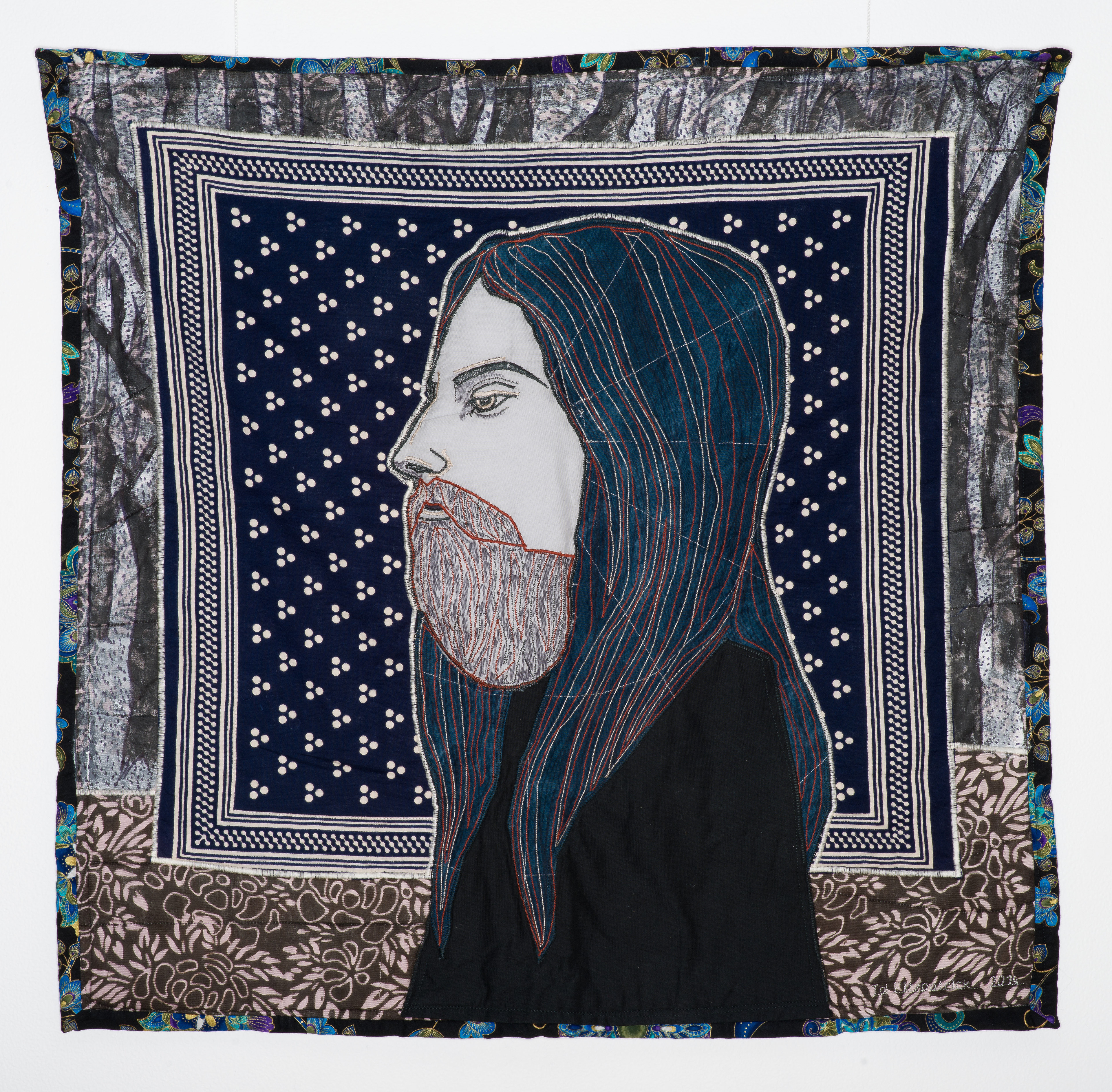 Portrait of musician Karl S. Williams (2015) 70cm x 70cm, repurposed materials, cotton thread, fabric paint and pens. Karl S. Williams used this as the album cover for his 2024 release 'Heartwood (solo)'.