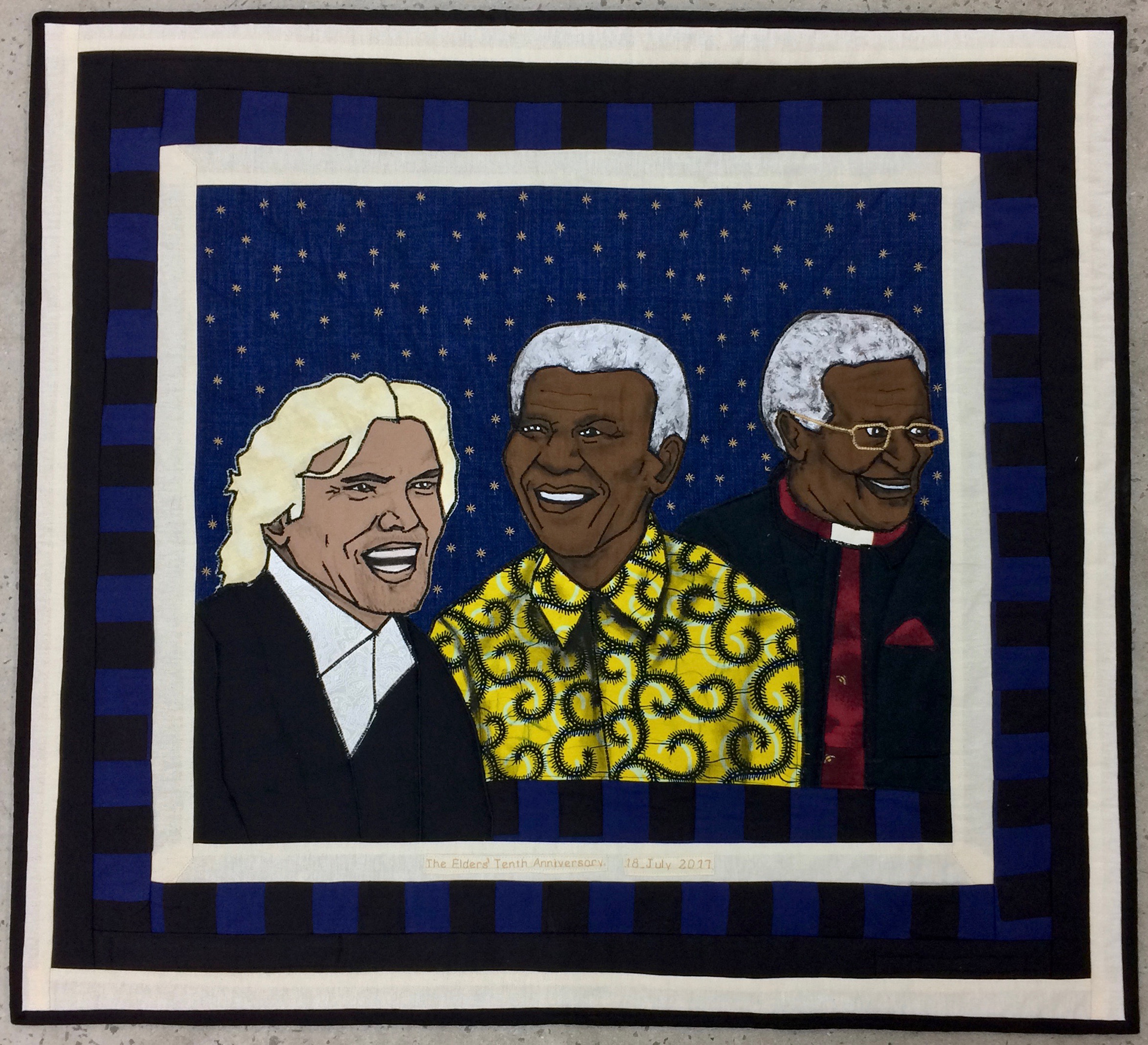 This piece features the portraits of Richard Branson, Nelson Mandela and Archbishop Desmond Tutu. This hanging was gifted to Richard Branson and marks the tenth anniversary of the founding of The Elders on the 18th of July 2007.