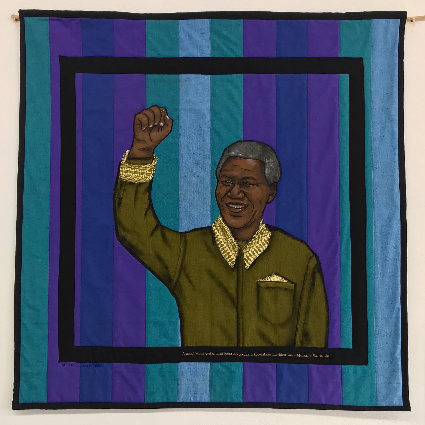 Nelson Mandela (2020) 120cm x 120cm, appliqué quilt made using new and recycled materials. This commission a gift for Van Jones.
